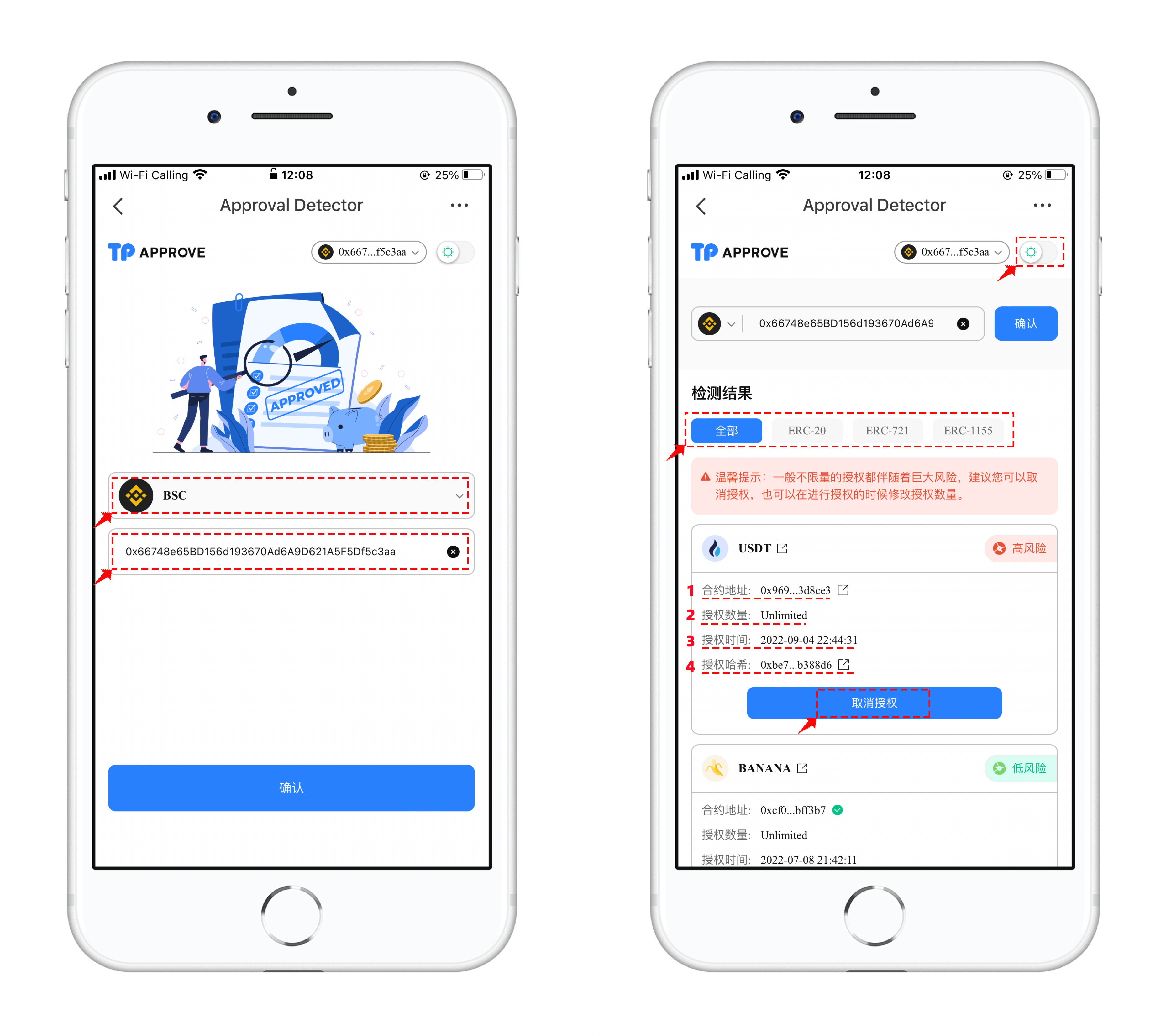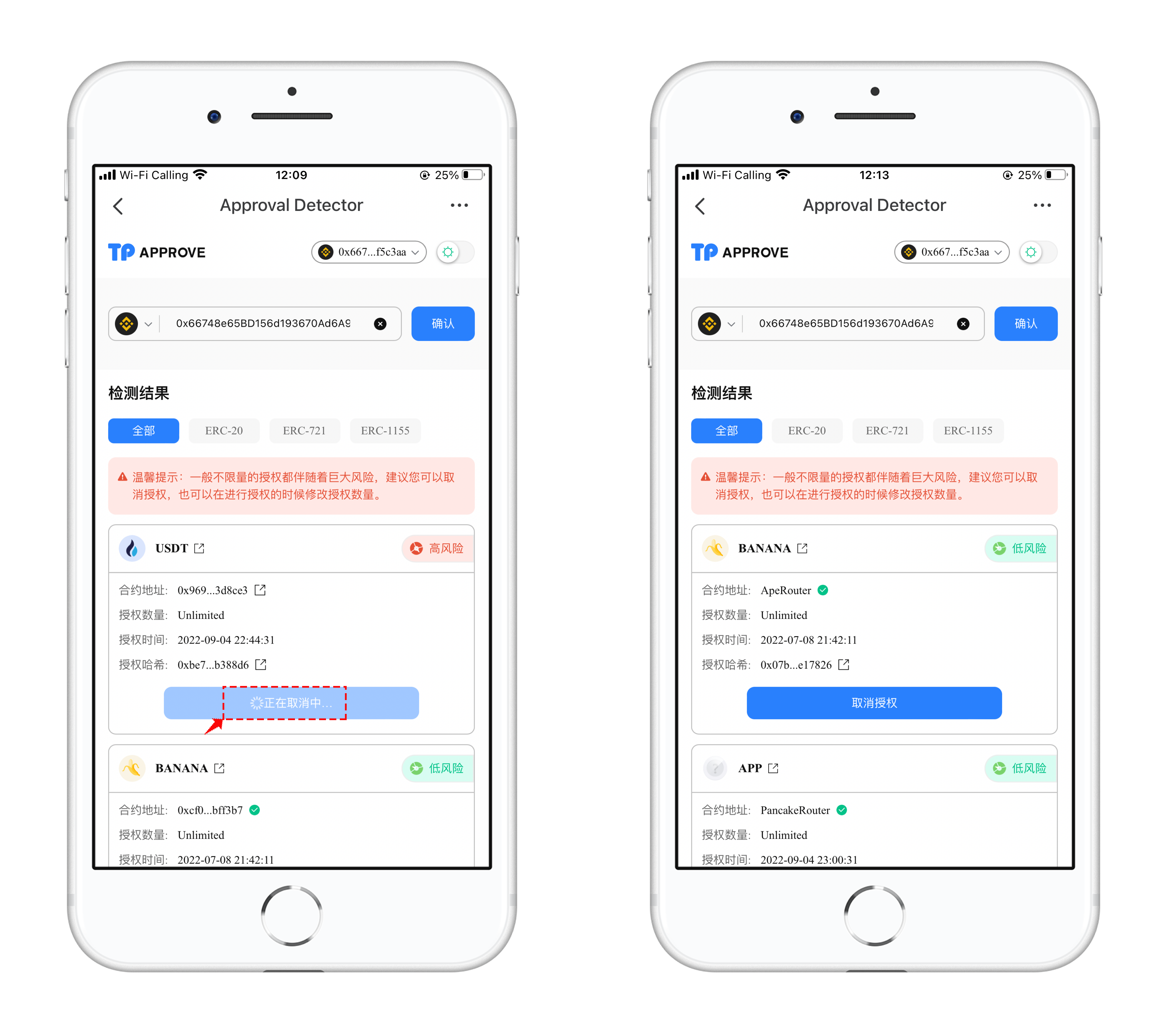 查询分类中可以支持当前的【代币】和【NFT】的检测，界面检测结果也很直观，右上角可以切换深色模式。授权信息显示的内容如下：