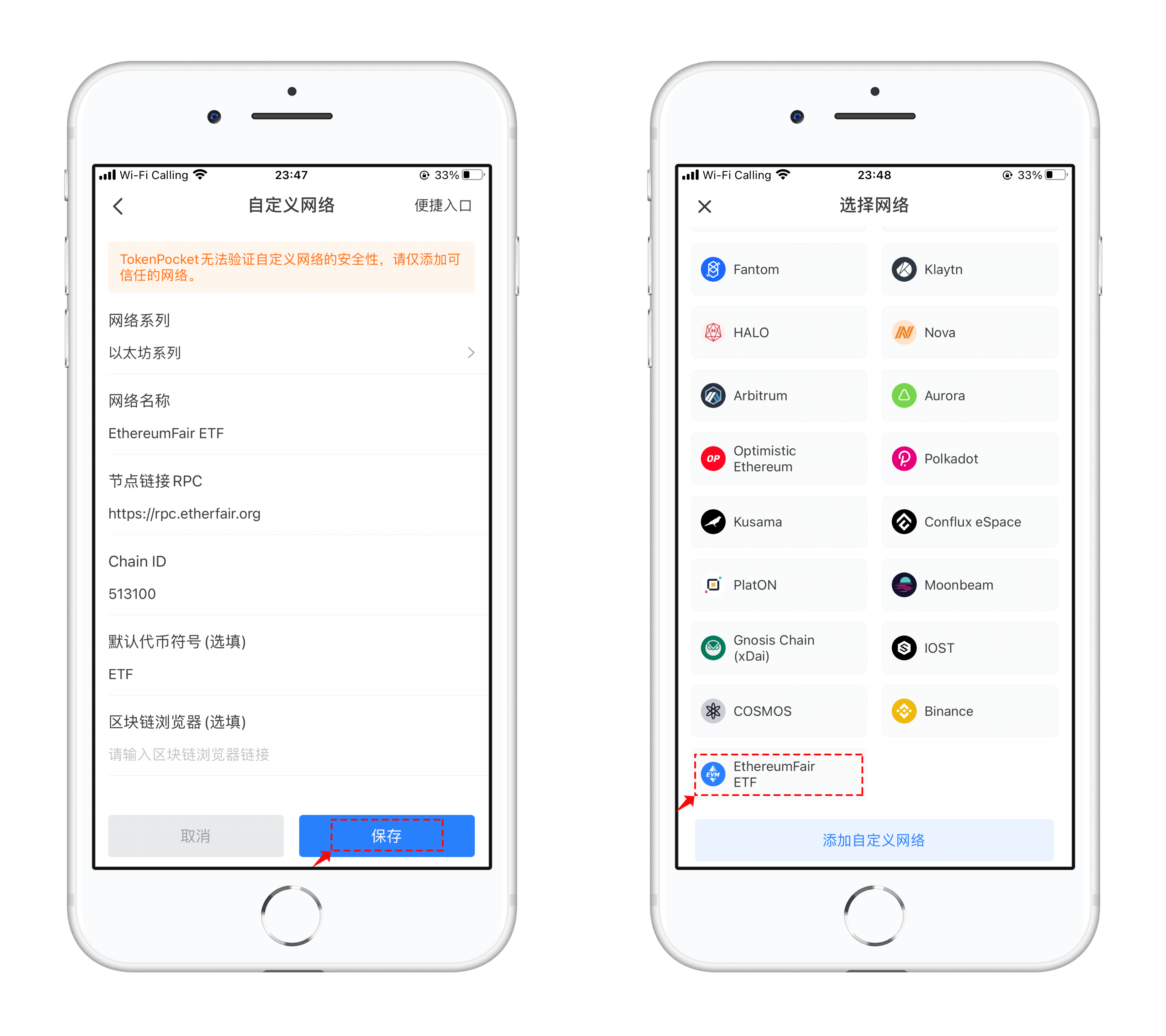3、核对信息后点击右下角的【保存】，即可添加成功。回到选择网络界面，下拉到最底部可以看到新添加的EthereumFair网络。