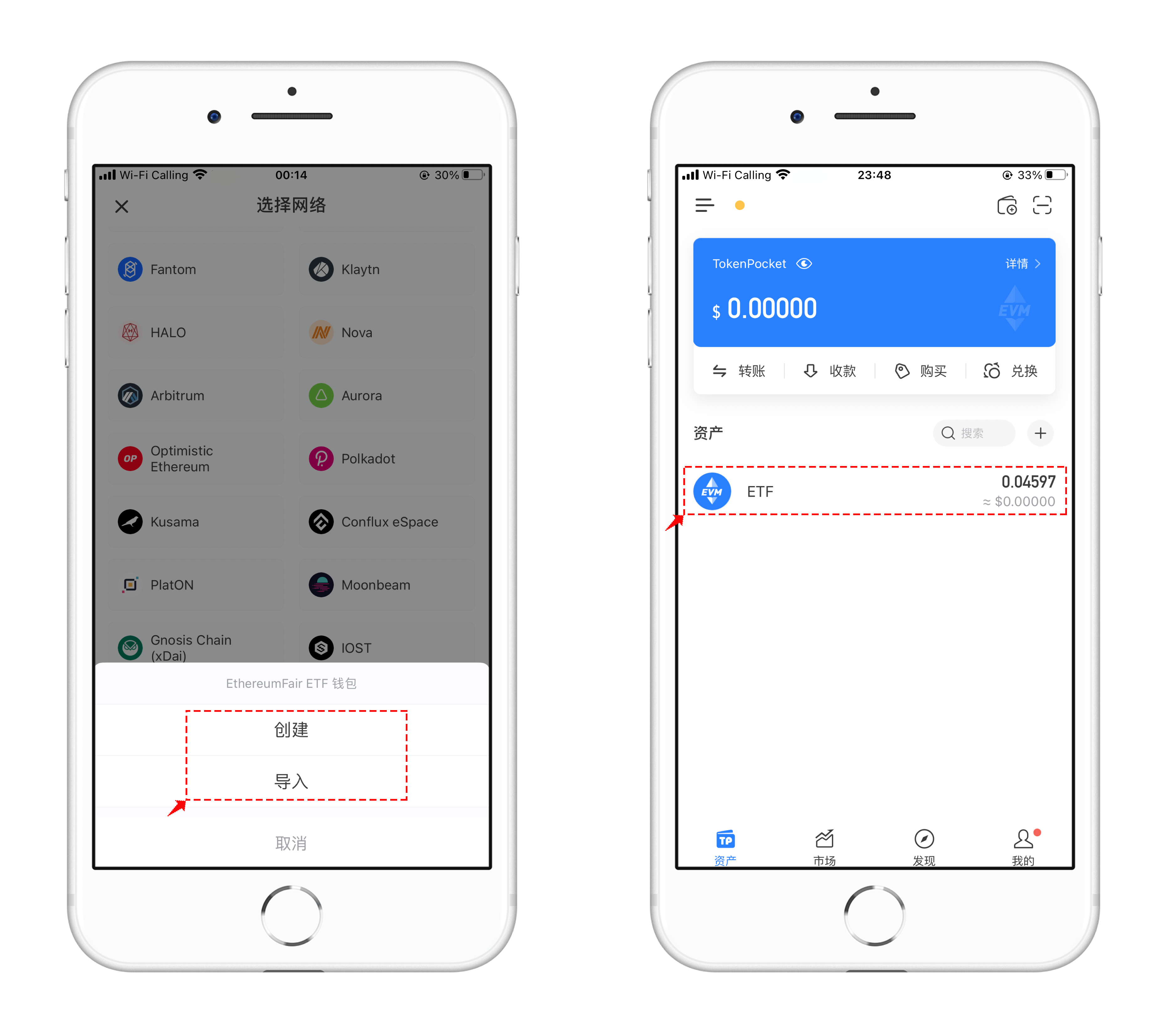 4、点击新增加的EthereumFair 公链，可以选择【创建】或【导入】方式使用ETF钱包，导入后就可以看到自己收到的ETF空投。