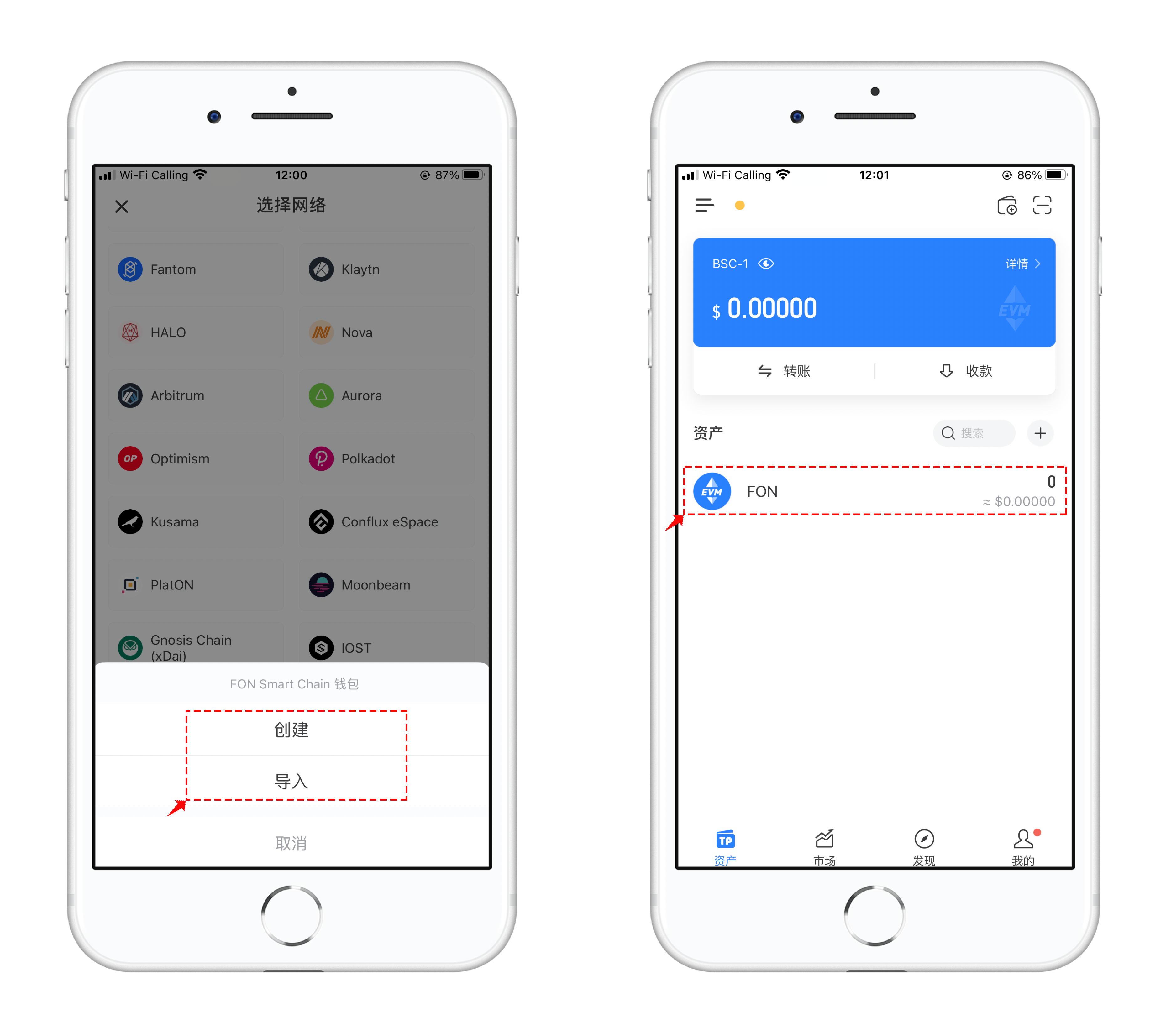 4、点击新增加的 FON Smart Chain 公链，可以选择【创建】或【导入】方式使用FSC钱包。