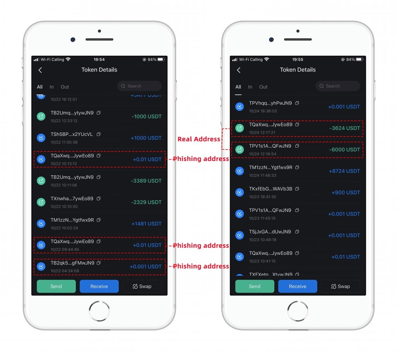 Recently, the TP Wallet technical team find a new kind of scam, which we named it “phishing” address.