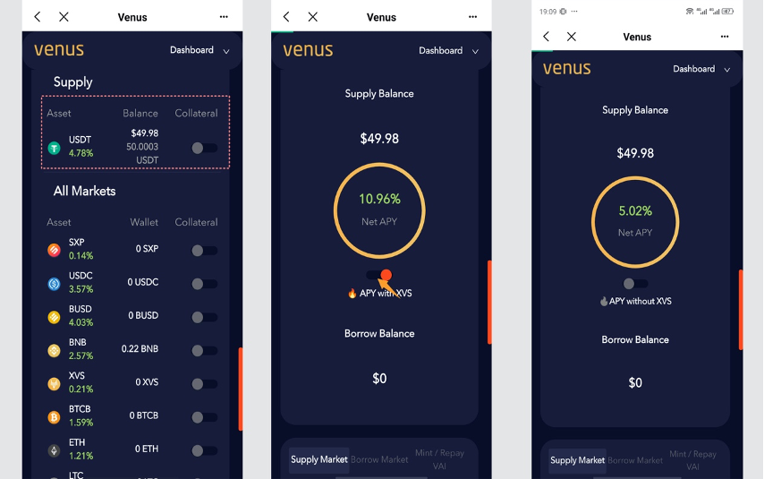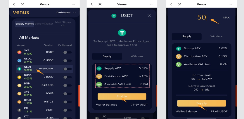 You can make a deposit in the 【Supply Market】 section and see the APY for each currency. Here I chose to deposit USDT and can see that the current APY for USDT deposits is 5.02% and the APY for XVS mining is 6.13%. The first time you deposit, you need to click 【Enable】 to authorize, you need to pay a small amount of BNB gas fee, then enter the amount and click【Supply】 to deposit successfully.