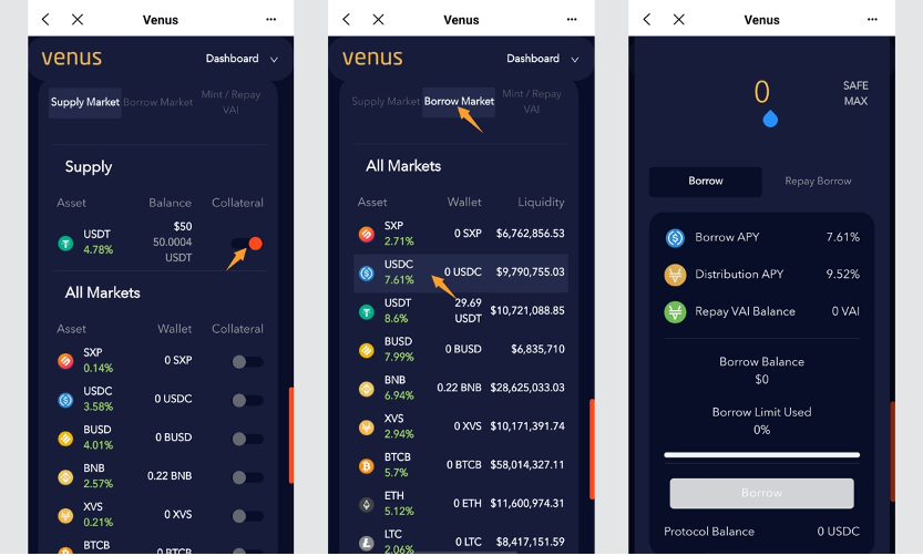 3: Loan The loan starts with a deposit and requires users to turn on the 【Collateral】button to do next step. When the deposit is enabled, vTokens credentials are obtained, which can be used to lend or issue stablecoins. The maximum loan amount available for deposits is 1:0.6. For example, a deposit of 10U in a deposit currency can be loaned up to 6U in any other currency. Firstly, click the button and use USDT as collateral, then click the 【Borrow Market】section to make a loan, you can see the loan interest rate and the number of liquidity pools for each currency, here I have chosen to loan USDC as an example.
