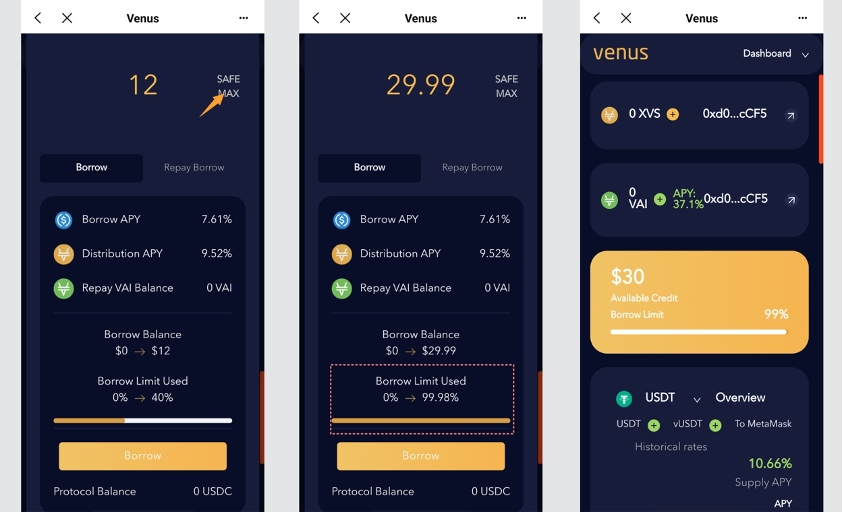 Click on ‘SAFE MAX’ and the system will automatically enter the maximum number of safe loans, the general ratio is 1:0.25, I deposited 50U, so the safe number here is 12, of course, we can enter the number of loans more or less than the safe value, but the maximum will not exceed 50 * 0.6U = 30U. I entered 30 here, you can see that my loan amount has reached 99.9% maximum.