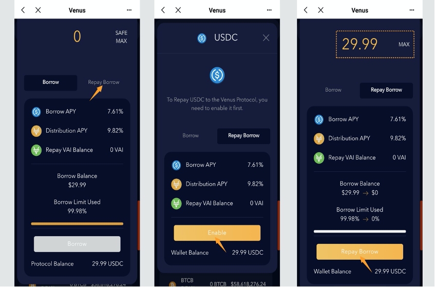 Open【Repay Borrow】 to make repayments. To make your first repayment, click on【Enable】 to authorize, then enter the amount to be repaid and the interest rate, and click on 【Repay】