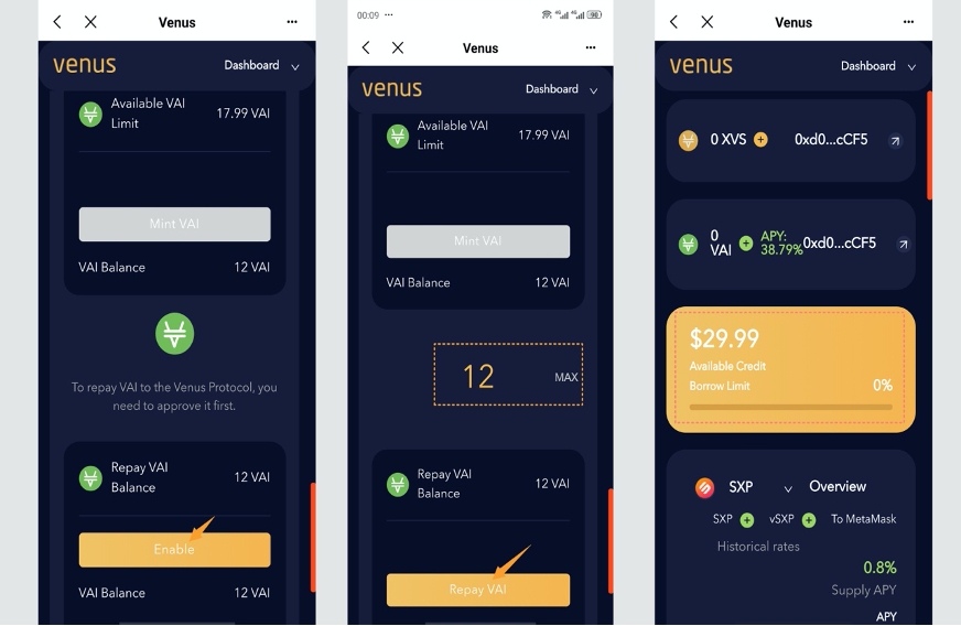 Click on Repay at the bottom of the page to make repayments. You will need to authorise your first repayment, then enter the number of VAI to be repaid and click on 【Repey VAI】 to make the repayment. Once the VAI has been repaid, you will receive the appropriate amount of credit.